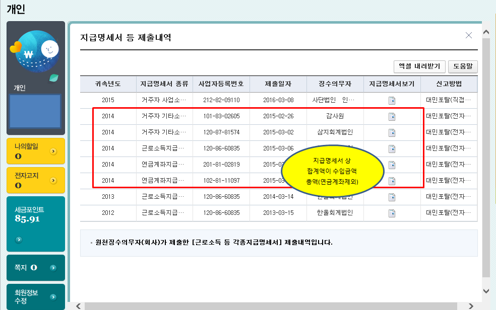 지급명세서등 제출내역 항목란을 클릭해 주세요