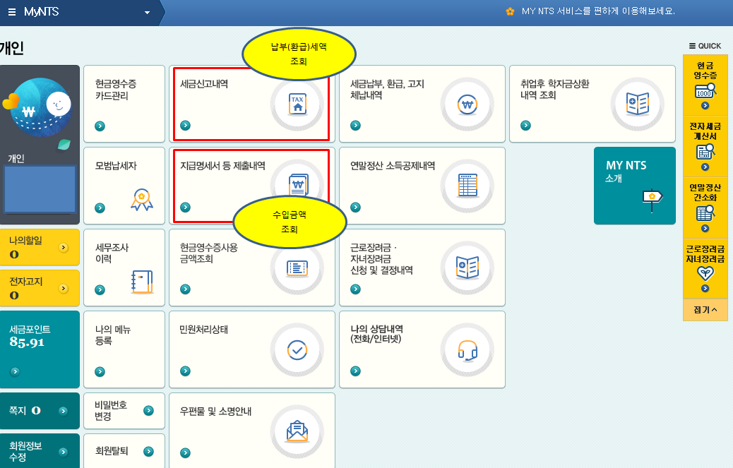 My NTS화면에서 환급세액 및 수입금액을 조회할 수 있는데요