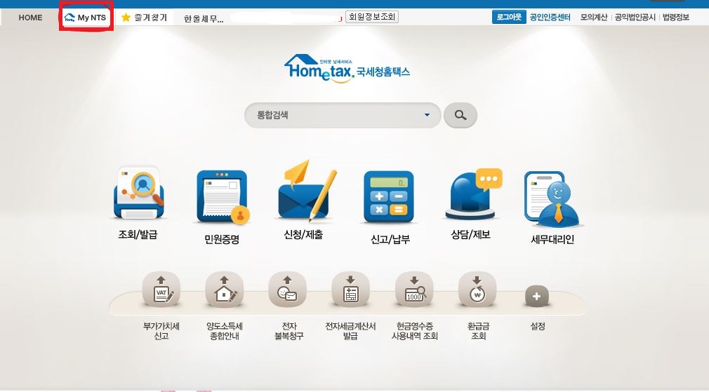 홈택스에 접속한 후 좌측 상단에 있는 MY NTS 메뉴로 들어갑니다.