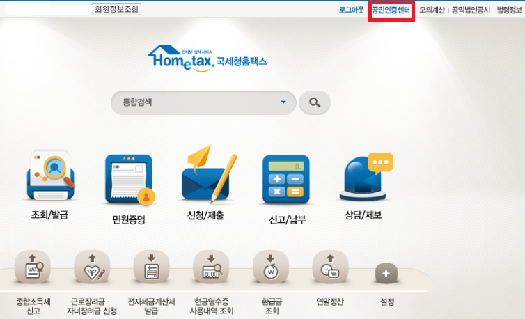 메인화면 상단의 공인인증센터를 클릭 해주세요