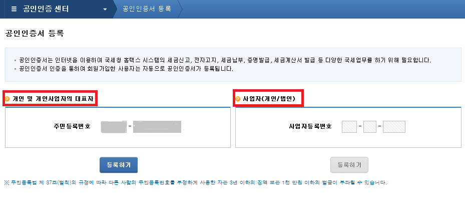 개인 및 개인사업자의 대표자의 경우는 주민등록번호를 기입하고 등록하기 버튼을 눌러주세요